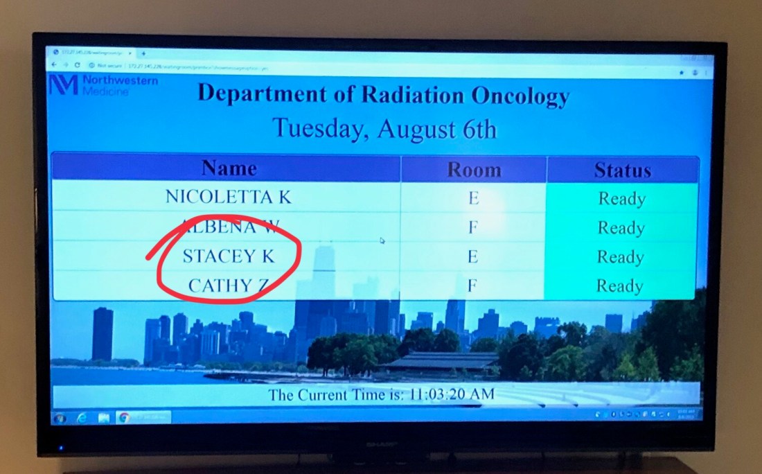 - Radiation is in the basement of Prentice. No windows and a bit dreary, but everyone that works in that department is so friendly and upbeat. Must seriously be a job requirement and/or awesome management and hiring. Upon arrival, I’d swipe in and my name would appear on the tv screen monitor in the waiting room. Once the words “checked-in” next to my name turned to “ready”, I’d walk into the dressing room, change into a robe and wait.
